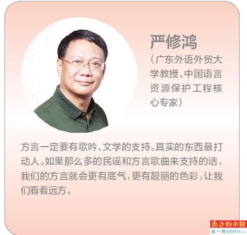 “方言一定要有歌吟、文学的支持。”广外教授、中国语言资源保护工程核心专家严修鸿说,“如果那么多的民谣和方言歌曲来支持的话,我们的方言就会更有底气、更有靓丽的色彩,让我们看着远方。”