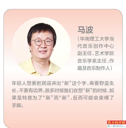 华南理工大学当代音乐创作中心副主任、艺术学院音乐学系主任马波坦言,“新”其实是最难的,年轻人是新民谣生长最好的土壤,“学生想要把新民谣做‘新’需要野蛮生长,不要有边界,特意为了新而新反而可能被束缚。”