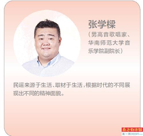 “民谣非常包容,很多地方的民谣来自地方民歌,地方民歌也会和民谣有一定的功能性转换。”男高音歌唱家、华南师范大学音乐学院副院长张学樑说道,“民谣本身来源于生活、取材于生活,根据时代的不同展现了不同的精神面貌。”