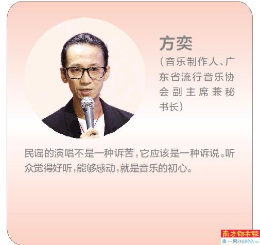 “歌词里必须要有自己的故事和情感。演唱感觉不是诉苦,是诉说。”音乐制作人、广东省流行音乐协会副主席方奕表示,民谣的特色在于编曲简单,而歌词像在写故事,比演唱更重要,“听起来好听,听众觉得感动就足够了。”