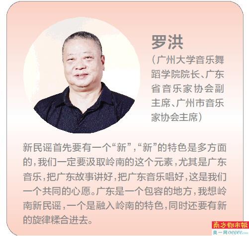 广州大学音乐舞蹈学院院长、广东省音乐家协会副主席罗洪则认为,岭南新民谣是要融入岭南特色,同时还要有新的旋律糅合进去。“我们把岭南特色讲好,把岭南的音乐传承好。新民谣首先要有新,一定要汲取岭南元素,尤其是广东音乐,把广东的故事讲好,把广东音乐唱好。”
