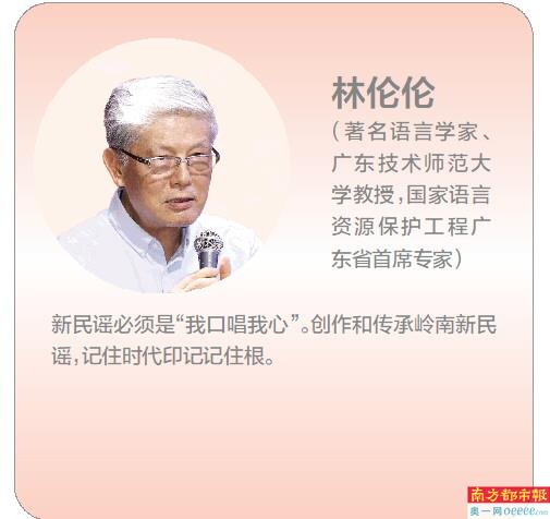 著名语言学家、国家语言资源保护工程广东省首席专家林伦伦希望,岭南新民谣能够保留广府粤语、客家话和潮汕方言作为载体。他还表示,岭南新民谣的“新”是从内容、创作形式到表演形式的新。他说:“新民谣应该是‘我口唱我心’,唱出我自己的、我家乡的甚至是这个时代的故事。”