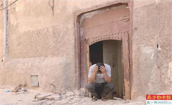 9月9日,在摩洛哥南部城市马拉喀什,一名男子蹲在自家门口。 新华社发