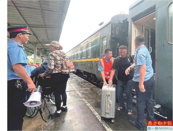 4. 列车驶入阳春火车站,工作人员协助旅客下车。