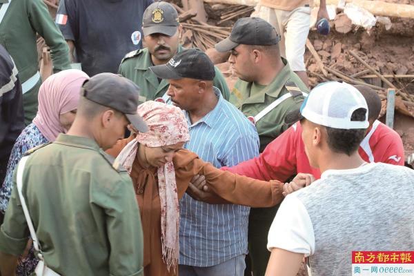 10日,摩洛哥豪兹,救援人员帮助一名受伤的妇女。 IC供图