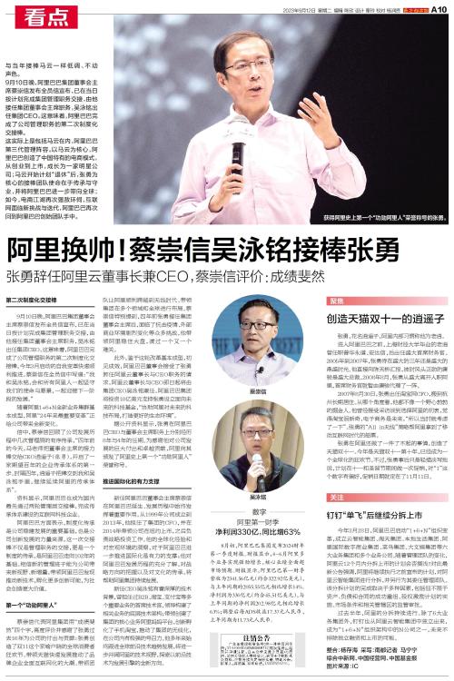 9月10日晚,阿里巴巴集团董事会主席蔡崇信发布全员信宣布,已在当日按计划完成集团管理职务交接,由他接任集团董事会主席职务,吴泳铭出任集团CEO。
