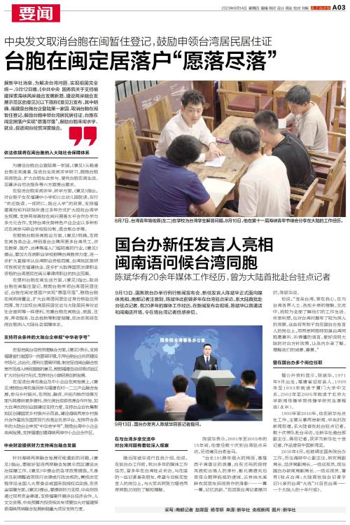 9月13日,国务院台办举行例行新闻发布会,新任发言人陈斌华正式面向媒体亮相。