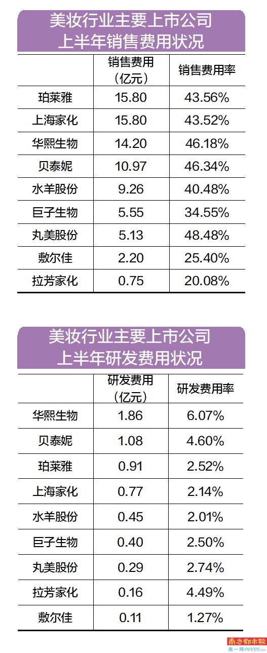 美妆行业上市公司均保持着较高的销售费用支出,今年上半年,上海家化、水羊股份(300740.SZ)、珀莱雅(603605.SH)、贝泰妮(300957.SZ)、华熙生物(688363.SH)、丸美股份(603983.SH)销售费用率均超过40%。