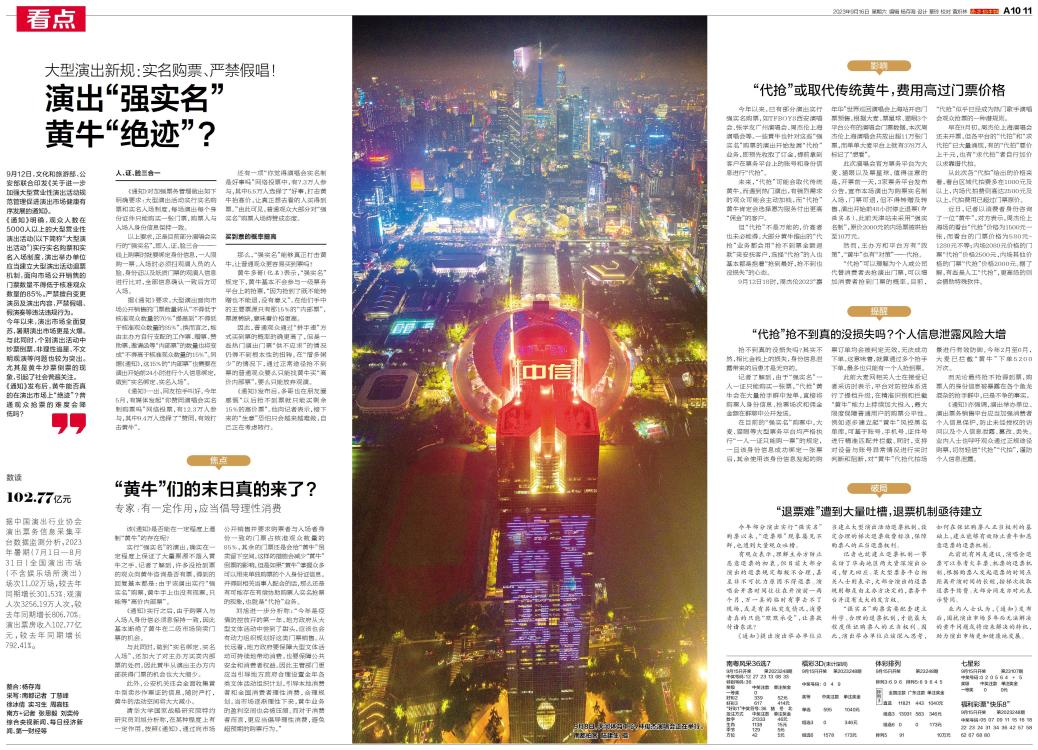 《通知》亦强调,演出举办单位、演出票务销售平台应当加强消费者个人信息保护,防止未经授权的访问以及个人信息泄露、篡改、丢失。业内人士也呼吁观众通过正规途径购票,切勿轻信“代抢”“代拍”,谨防个人信息泄露。