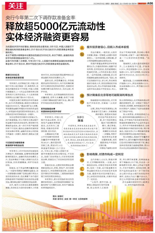 为巩固经济回升向好基础,保持流动性合理充裕,9月15日,中国人民银行下调金融机构存款准备金率0.25个百分点(不含已执行5%存款准备金率的金融机构)。