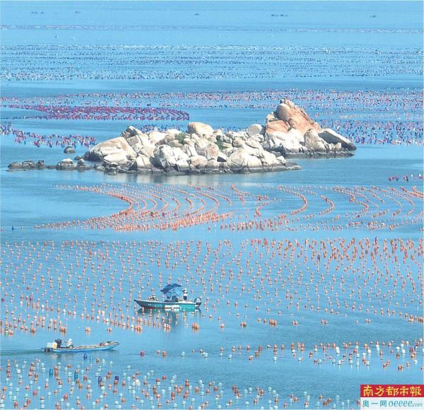 这片“彩虹海”是汕头南澳县牡蛎生态养殖基地,在蔚蓝的海面上,色彩斑斓的新型环保浮筒方阵宛若彩虹,在阳光下熠熠生辉,渔舟穿梭,构成一幅美丽缤纷的“海上牧场”图。在浮筒之下是养殖的牡蛎,成排的牡蛎纵横交错,站在船上,水面以下的牡蛎清晰可见。彩色环保浮筒主要用于固定和悬挂生蚝,替代容易造成白色污染的泡沫浮球,也造就了这一望无际的彩色海洋。这些环保浮球不仅回收方便,还能通过控制养殖密度、牡蛎滤水时间,进而提高牡蛎的产量和质量。