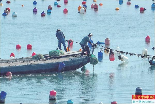 渔民向海里投放生蚝幼苗。 南都拍客 陈志强 摄