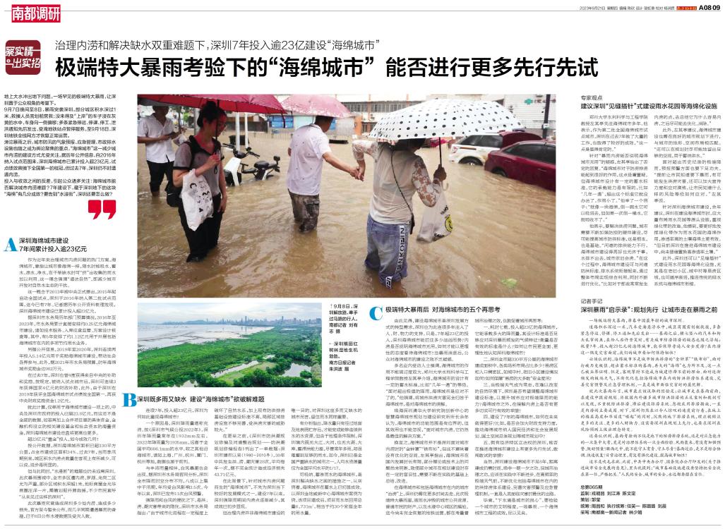 三、当极端天气成为常态,在难以改变的自然环境下,深圳是否有望调整海绵城市建设标准,以提升城市应对极端降雨的能力?海绵城市之外,在缓解内涝上是否有更多切实可行有效的举措?