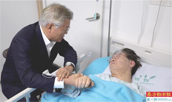 9月19日,进行绝食抗议的韩国最大在野党共同民主党党首李在明因健康恶化入院治疗,韩国前总统文在寅赴医院探望。 IC供图