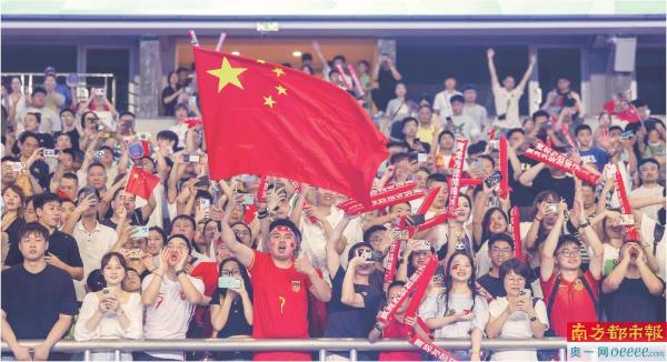 2023年9月19日,在男子足球小组赛A组,中国队以5比1大胜印度队,现场球迷在庆祝。 南都记者 黎湛均 摄