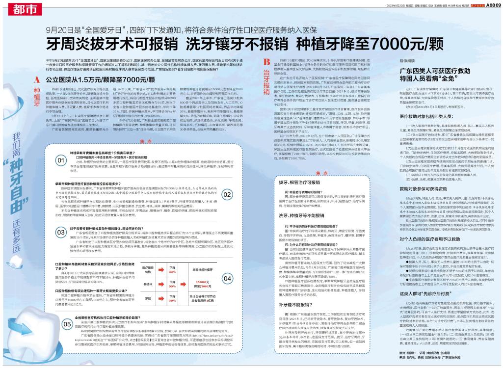 今年9月20日是第35个“全国爱牙日”,国家卫生健康委办公厅、国家医保局办公室、金融监管总局办公厅、国家药监局综合司近日发布《关于进一步推进口腔医疗服务和保障管理工作的通知》(以下简称《通知》),其中提出对公立医疗机构种植体植入费、牙冠置入费、植骨手术等价格进行专项治理;将治疗性医疗服务项目和医用耗材按程序纳入基本医保支付范围。广东情况如何?看牙到底能不能用医保报销?