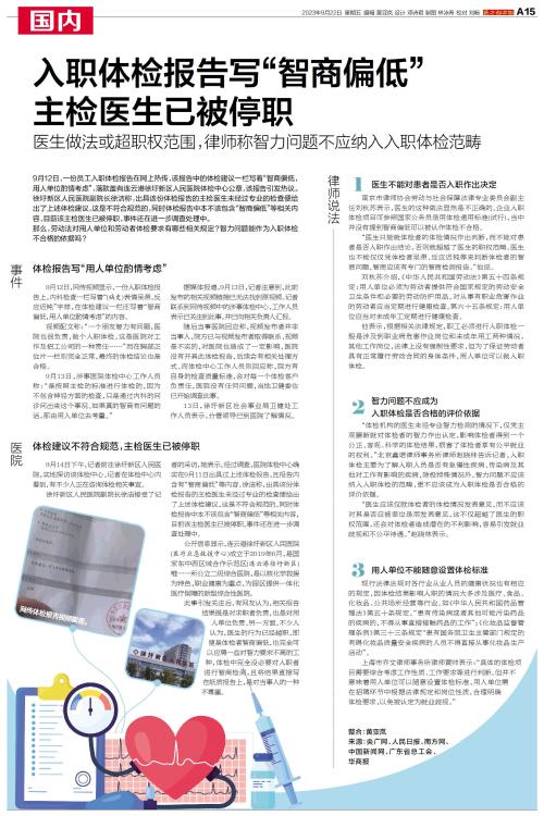9月12日,一份员工入职体检报告在网上热传,该报告中的体检建议一栏写着“智商偏低,用人单位酌情考虑”,落款盖有连云港徐圩新区人民医院体检中心公章,该报告引发热议。