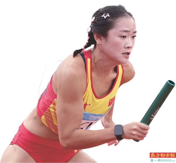 成都第31届世界大学生夏季运动会田径项目4×100米接力决赛,中国选手梁小静在比赛中。 南都记者 黎湛均 摄