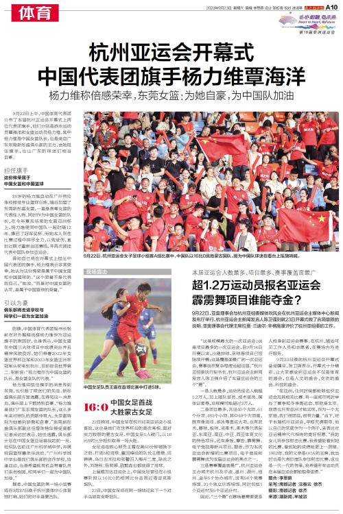9月22日上午,中国体育代表团公布了本届杭州亚运会开幕式上两位代表团旗手,他们分别是游泳运动员覃海洋和女篮运动员杨力维。其中杨力维是中国女篮队长,也是来自广东东莞新彤盛俱乐部的主力,由她担任旗手,也让广东的球迷们相当自豪。