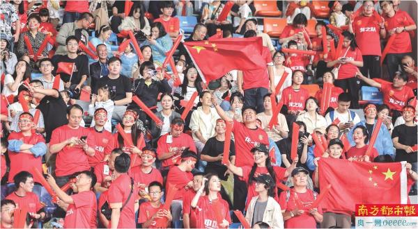 9月22日,杭州亚运会女子足球小组赛A组比赛中,中国队以16比0战胜蒙古国队。图为中国队球迷在看台上摇旗呐喊。
