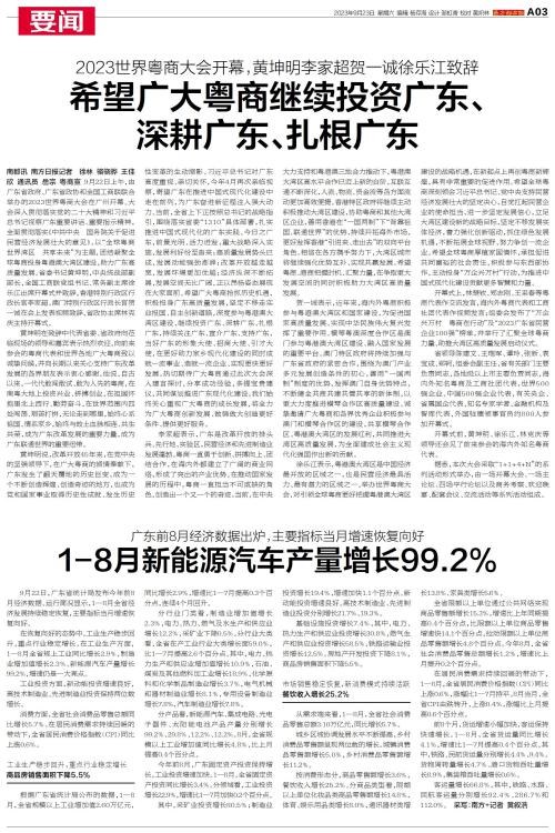 9月22日上午,由广东省政府、广东省政协和全国工商联联合举办的2023世界粤商大会在广州开幕。