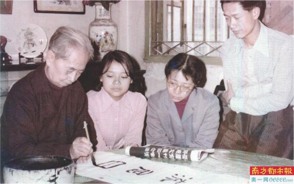 吴子复先生晚年在家中为书法爱好者示范临写隶书。
