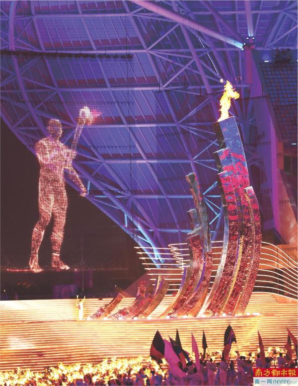 昨日举行的杭州亚运会开幕式上,由上亿网民线上参与汇聚而成的数字人跑过会场,和场内火炬手一起点燃名为“潮涌”的主火炬塔,成为开幕式最闪耀的一瞬。 南都、N视频记者 徐杰 摄
