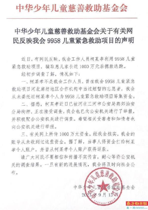 9月13日,中华儿慈会发布声明称柯善孝近日已被河北三河市公安局燕郊治安分局拘押,正接受调查。中华儿慈会回应,表示希望能推进三个举措。一是在互联网平台上线针对受骗家庭的专项筹款项目,募集资金帮助受骗家庭。二是收集受骗家庭信息,对于符合9958项目资助标准的困境家庭,开通绿色通道由9958项目直接为患儿发放救助金。三是由合作律所提供法律援助服务。