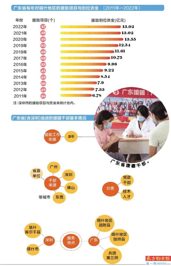 据喀什地区国民经济和社会发展统计公报透露,2011年-2022年,广东(除深圳外)共落实援助项目600个,到位资金124.22亿元;深圳的援助项目则为629个,超100亿元援助资金到位。