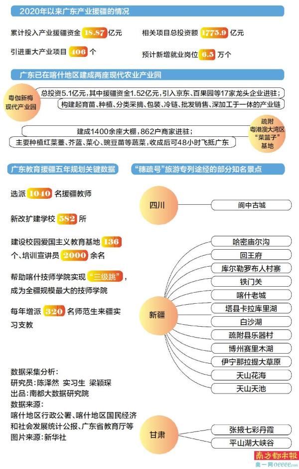 从2010年新一轮对口援疆工作开展以来,广东对口支援喀什地区疏附县、伽师县和兵团第三师,深圳则单列对口支援喀什市和塔什库尔干县。这片中国日落最晚的土地与4000公里外的广东有着深厚情缘。南都大数据研究院统计了2011年以来广东的援助项目与所落实的资金。
