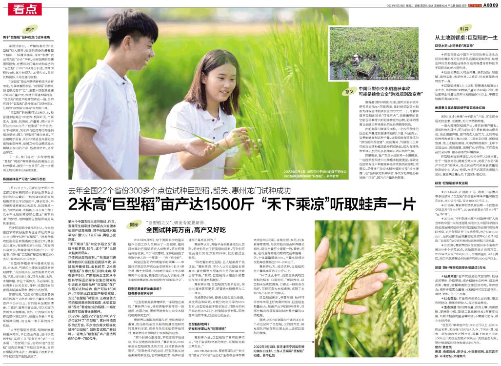 2022年,全国22个省份300多个点位试种了“巨型稻”,累计种植面积约2万亩,不少地方首次规模化试种“巨型稻”,创新尝试推广新品种,一些地方“巨型稻”亩产量达到650公斤-750公斤。