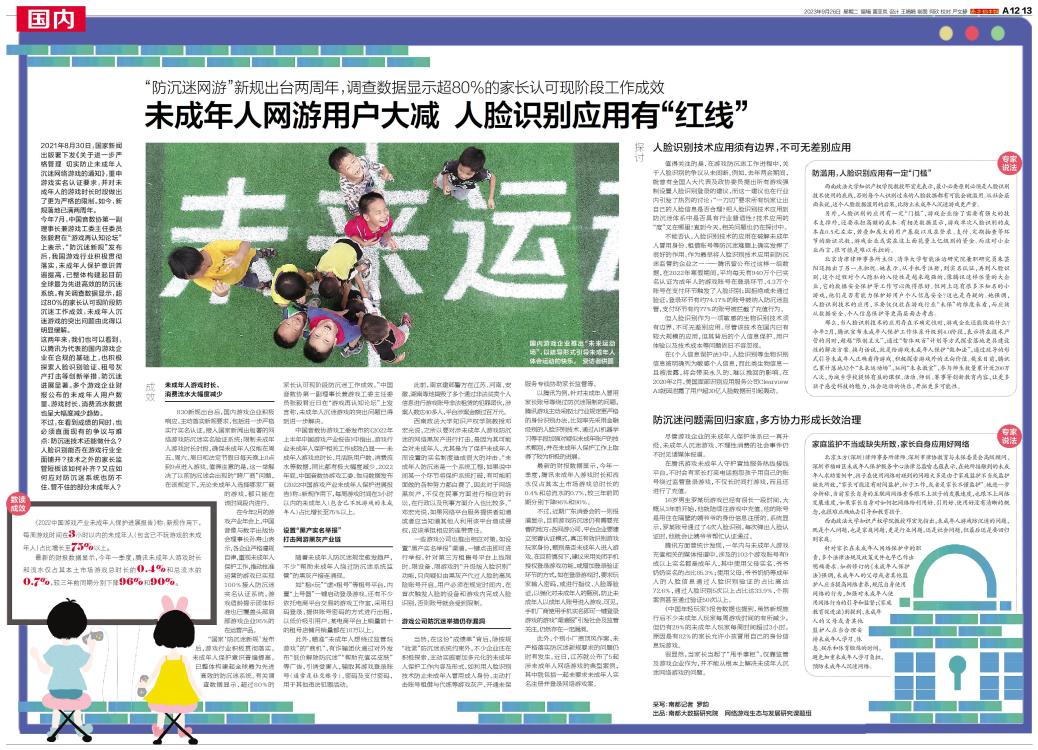 未成年人网游用户大减 人脸识别应用有“红线”