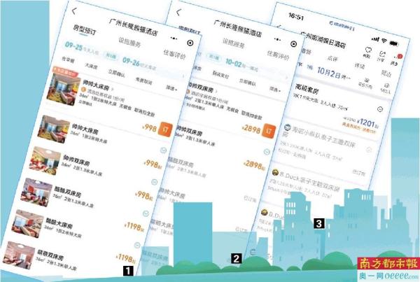 1.2. 广州长隆熊猫酒店9月25日“帅帅双床房”的价格为998元/晚,10月1日价格变为2898元/晚。 3.毗邻白云山的广州南湖假日酒店,其各类主题亲子房在国庆当日已被订满。