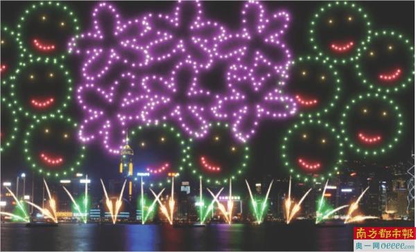 洋紫荆及笑脸图案在空中绽放,表达家在香港,对未来充满美好憧憬。