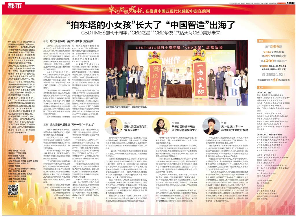 9月26日下午,广州(国际)科技成果转化天河基地,“十载相伴,不负遇见”——CBDTIMES创刊十周年暨“CBD之星”致敬活动在此举行。