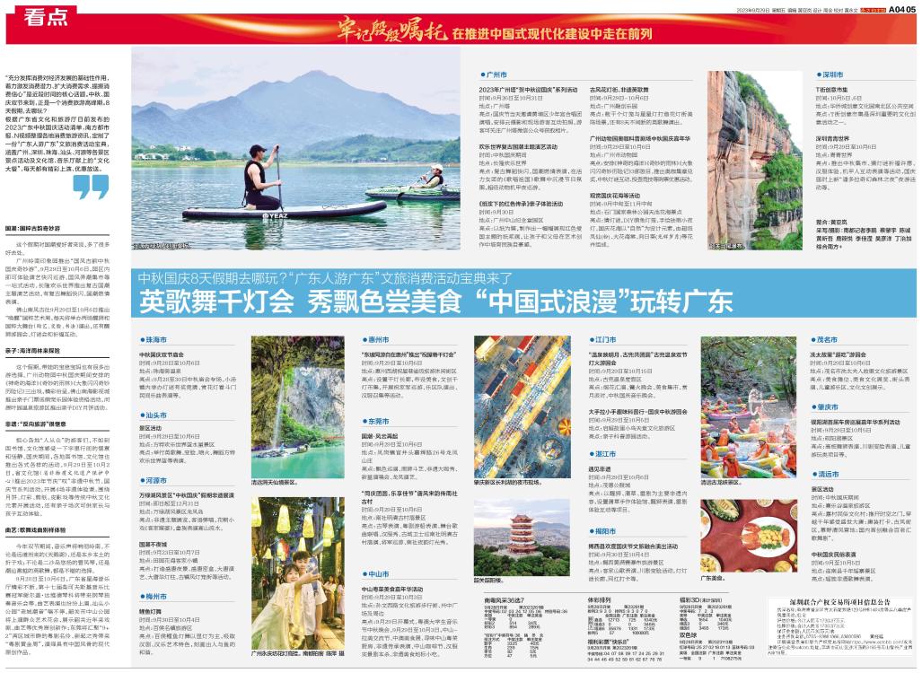根据广东省文化和旅游厅日前发布的2023广东中秋国庆活动清单,南方都市报、N视频整理各地消费旅游资讯,定制了一份“广东人游广东”文旅消费活动宝典,涵盖广州、深圳、珠海、汕头、河源等各景区景点活动及文化馆、音乐厅献上的“文化大餐”,每天都有精彩上演、优惠放送。