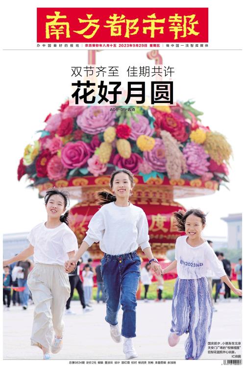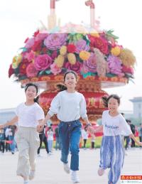 国庆前夕,小朋友在北京天安门广场的“祝福祖国”巨型花篮前开心玩耍。IC供图 详见:A04-05·看点