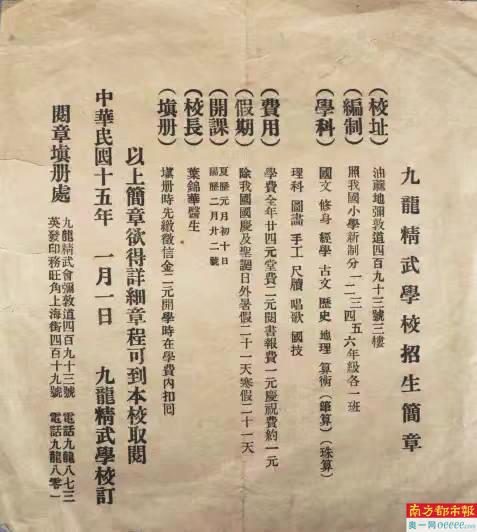 1926年九龙精武学校招生简章。内中详列校址、编制、学科、费用等内容。