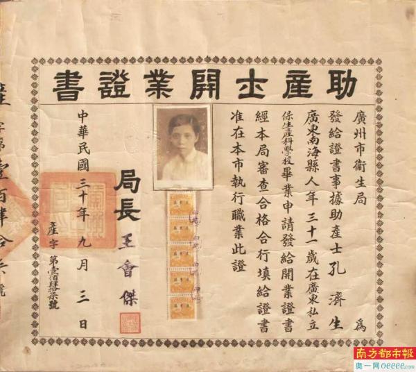 1942年(民国三十年)的助产士开业证书。广州市卫生局发给助产士孔济生,准在本市执行职业此证。