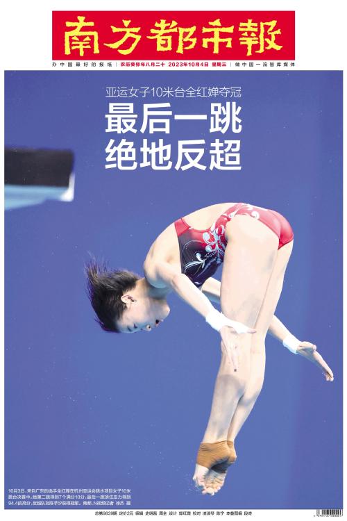 10月3日,来自广东的选手全红婵在杭州亚运会跳水项目女子10米跳台决赛中。