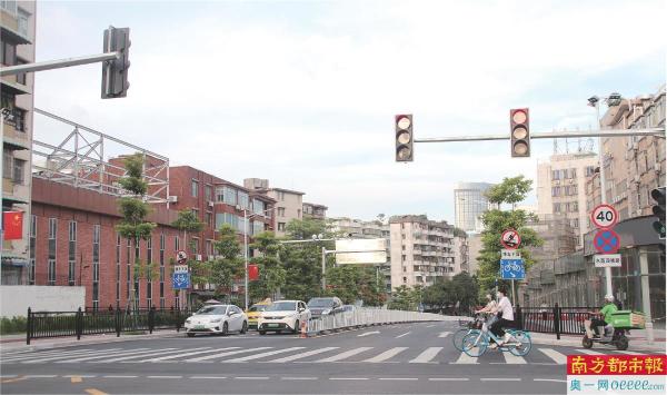 新修建的西段道路,连通了水荫路和已修建好的东段道路。人行道绿灯亮起,市民有序通过。