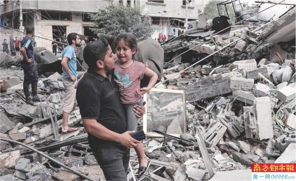 10月7日,一名男子抱着哭泣的儿童站在加沙城一处废墟旁。