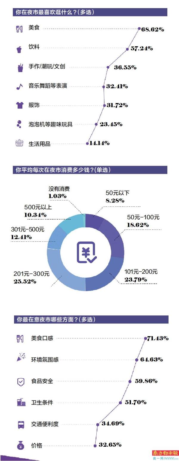 南都大数据研究院的民调数据显示,最吸引受访青年逛夜市的原因是感受生活气息。同时,有64%的受访者选择夜市时在意“环境氛围感”。对消费者来说,除了美食的诱惑,还希望夜市提供多元娱乐方式,成为新型社交场所。
