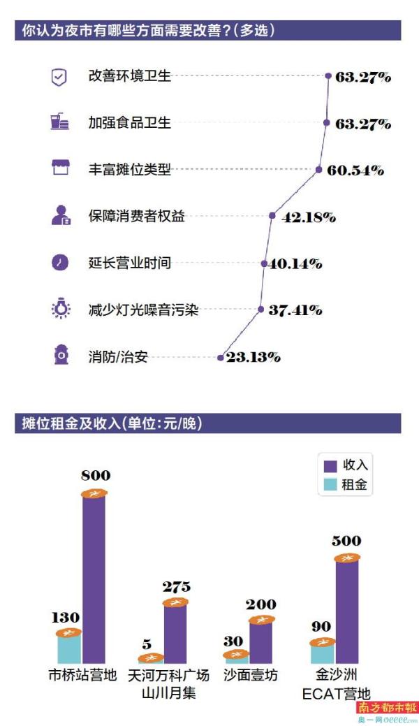 南都大数据研究院的民调数据显示,超过60%的受访广东年轻人认为夜市应该改善环境卫生和确保食品卫生,此外,丰富摊位类型(60.54%)、保障消费者权益(42.18%)、延长营业时间(40.14%)也有较高需求。