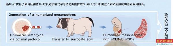 将人的干细胞注入到猪胚胎,需要攻关三个阶段,“首先要保证这个供体细胞可以存活,改造供体细胞,增强细胞的竞争能力,同时提高干细胞的分化能力。”王教伟进一步解释道,下一步就是利用基因编辑工具,在猪胚胎中敲除两个肾脏发育的关键基因,产生空缺的肾脏生态位,干细胞就会在猪胚胎里往肾脏器官进行分化发育;最后就是在优化了嵌合胚胎体系,以及对移植代孕母体时期的探索后,将人的干细胞注入到猪胚胎成功得到嵌合胎儿。
