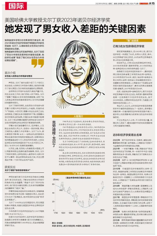 瑞典皇家科学院9日在斯德哥尔摩宣布,将2023年诺贝尔经济学奖授予美国经济学家克劳迪娅·戈尔丁,以表彰她在女性劳动力研究领域的突出贡献。