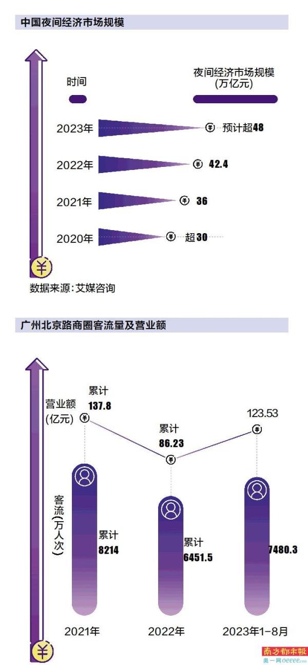 2020年,《关于提振消费促进市场繁荣的若干措施》提出以琶醍、北京路、天河路商圈等为重点,打造一批具备岭南特色、影响力大的地标性夜间经济集聚区。据广州北京路文化核心区管理委员会数据,今年1-8月,北京路客流总量7480.3万人次,同比增长65.5%,总营业额123.53亿元,同比增长87.2%,人气和商业氛围位居全国步行街前列。此外,据广州市越秀区商务局数据,北京路夜间营业商户占总商户比重达94%。
