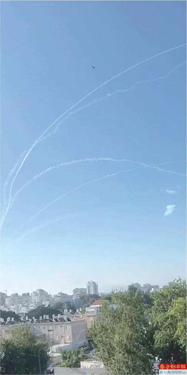 以色列“铁穹”防空系统拦截火箭弹的轨迹清晰可见。