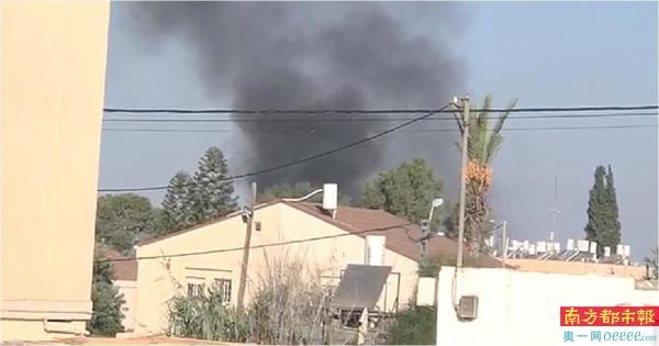 以色列有建筑被火箭弹击中,冒出滚滚浓烟。