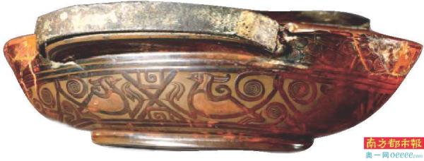 在大英博物馆众多的中国文物里,漆器占有一个颇为引人注目的位置,展品中有自汉代到明清的各代漆器。其式样之美、色彩之丽令人叹为观止。1955年从布鲁克·塞维尔(Brooke Sewell)手里获得的西汉雕花漆杯便是其中之一。它长17.7 厘米,木质胎体(能从一些破损处看到里面的木胎),耳杯造型,呈椭圆形,两边各有一个镀金的把手。